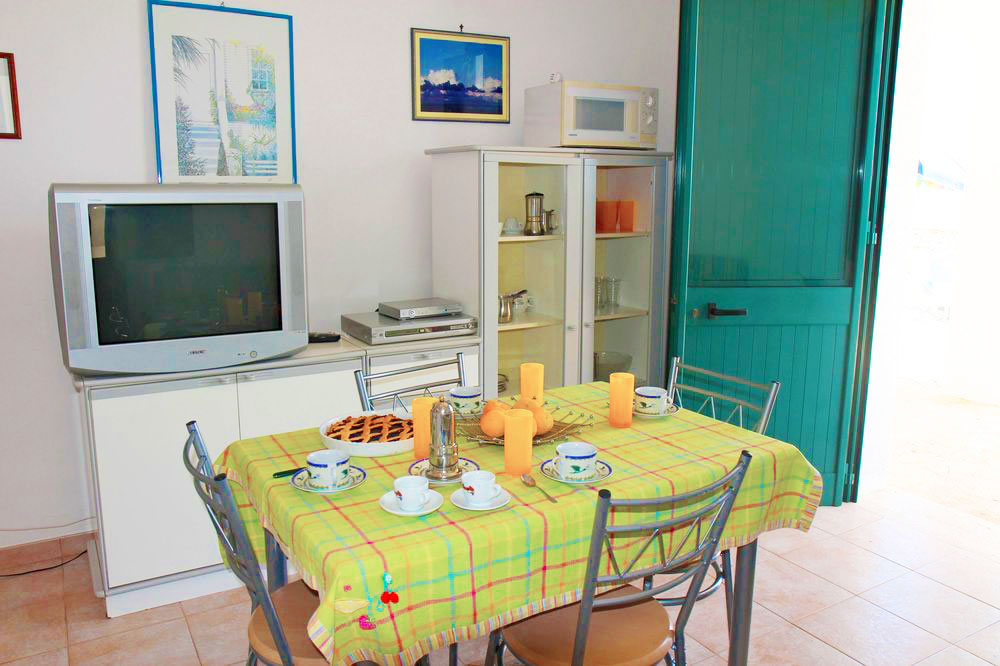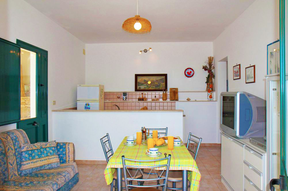 La villetta è ampia circa 60 mq. La zona giorno è formata da un ingresso/soggiorno con angolo cottura, munito di divano e TV. La zona notte è composta da due camere da letto, di cui una matrimoniale ed una doppia, ed un bagno completo con box doccia.